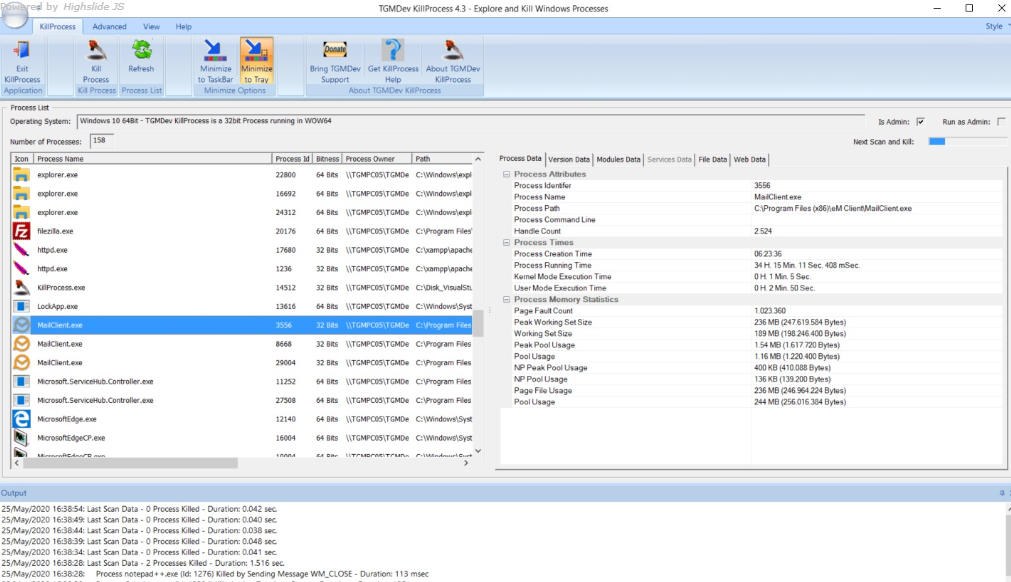 | 윈도우를 쓰다보면 원치 않는 프로세스가 많이 실행 될 때가 있습니다. 그럴 경우 어떤 녀석들이 내 컴퓨터를 잡아먹고 있고 리소를 맛있게 먹고 있는지 알아내고 KillProcess는 Windows XP, Windows 7 및 Windows 8에서 실행되는 서비스를 포함한 모든 프로세스를 탐색하고 종료하는 데 사용되는 Windows 유틸리티입니다. 특징: 데이터 스토리지에 대한 Win7 및 Win8 요구 사항을 준수하는 개선 된 사용자 인터페이스 프로세스 열거 : 응용 프로그램은 시스템 주소 공간에서 현재 실행중인 프로세스를 열거하고 프로세스 아이콘, 프로세스 이름 및 실행중인 프로세스의 식별자로 목록을 업데이트합니다. 메시지 닫기와 필요한 경우 TerminateProcess 함수를 사용하여 프로세스를 부드럽게 종료하십시오. 선택한 프로세스를 개별적으로 또는 동시에 죽이기 개별 프로세스에 대한 향상된 정보 제공 : 주요 정보 처리 (메모리 사용, ..) 공정 버전 정보 로드 된 모듈 목록 윈도우 실행중 프로세스를 탐색하고 종료 유틸리티 KillProcess 다운 http://www.tgmdev.be/applications/killprocess/killprocess_43.php |