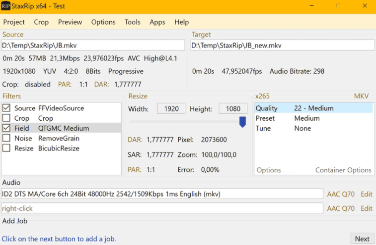 | DVD, DVB 캡처 및 더 많은 형식을 MPEG-4로 쉽게 변환 프로그램 요즘 날씨가 따뜻해졌네요. StaxRip을 사용하면 DVD, DVB 캡처 및 더 많은 형식을 DivX, XviD 및 x264와 같은 MPEG-4로 쉽게 변환 할 수 있습니다. 오픈 소스 애플리케이션으로서 StaxRip은 완전 무료입니다. 지원되는 형식 : 비디오 형식 : DivX, XviD, x264, MPEG-2, MPEG-4 오디오 형식 : MP3, AC3, MP2 / MPA, AAC, DTS, WAV 컨테이너 형식 : AVI, MP4, MPG, MKV, DIVX 프로그램 특징: 스파이웨어, 애드웨어 또는 기타 형태의 맬웨어가 없습니다. 오픈 소스, 프리웨어. 레지스트리 팽창이 없으며 설정은 응용 프로그램 디렉터리 또는 사용자 디렉터리 내의 파일에 저장됩니다. Windows를 새로 설치 한 후 설정이 손실되지 않습니다. 어색한 설정 / 설치, 시스템 변경, 시스템 팽창 및 쓰레기 없음. 사용하기 쉽고 다목적이며 사용자 정의가 가능합니다. 필터, 코덱 등에 대한 합리적인 기본값 온라인 도움말 (지원), 상황에 맞는 도움말 및 포럼 지원을 포함한 풍부한 도움말 시스템. 풍부하고 편리한 절단 시설 (예 : 광고를 제거합니다. 일괄 처리 (작업). 어색하거나 위험한 코덱 팩 또는 애플리케이션 팩 대신 필요한 타사 애플리케이션을 투명하게 관리, 통합 및 다운로드 할 수있는 풍부한 기능 세트. AviSynth는 탁월한 비디오 품질을 달성하고 거의 모든 소스 형식을 지원합니다. 최신 최고의 기술인 .NET Framework 2.0을 사용한 신속한 개발 Reportet 버그는 빠르게 수정되며 종종 같은 날 새 버전을 사용할 수 있습니다! 많은 기능 요청이 매우 빠르게 통합됩니다. 프로그램 다운 github.com/staxrip/staxrip |